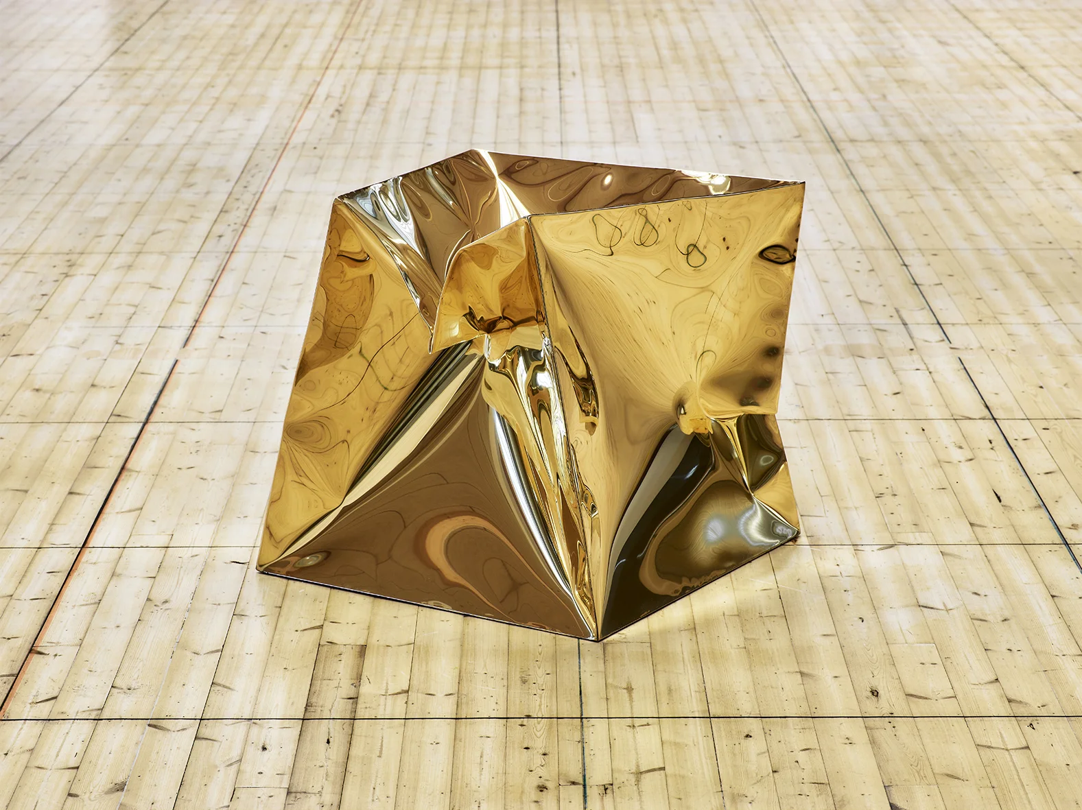 The artwork visualizes the impact of breathing in a closed space, where a negative mass renders visible by being sucked out of a brass cube at different intervals, with the total volume equalling the amount of oxygen the artist’s own body uses over a period of one hour, leaving a selection of different stages of collapses.